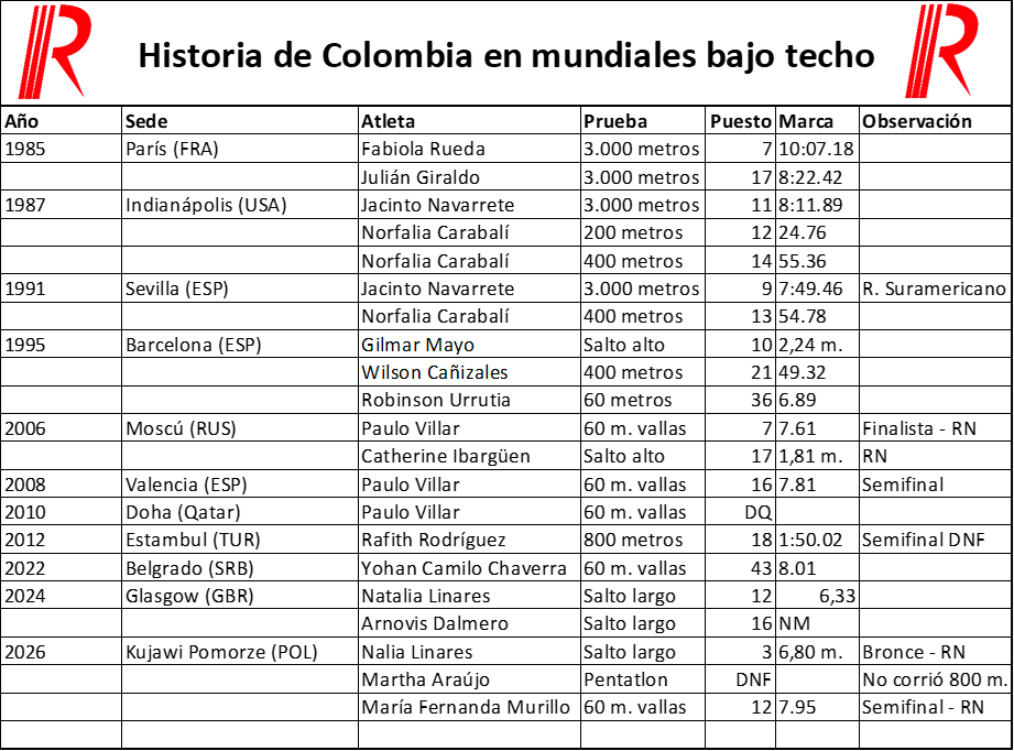 Por priemra vez en la historia, un atleta colombiano logra una medalla en un mundial indoor. La hazaña la hizo realidad Natalia Linares, quien se quedó con la medalla de bronce en la prueba de salto largo, tras alcanzar una marca de 6,80 metros en la cita de Kujuawi Pomorze (Polonia).