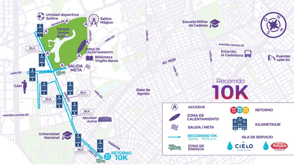 Y la distancia «Inspirada 5K» ofrece una opción accesible y apta para corredores de todos los niveles y rangos de edad. Siguiendo con este orden, el trazado empleará la calle 53 al occidente hasta la Av. 68 para luego por la misma calle 53 buscar el sector del CAN y dirigirse por la carrera 60 en sentido sur-norte a la meta.