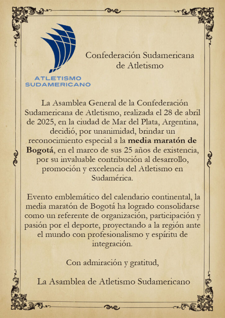 «La Asamblea General de la Confederación Sudamericana de Atletismo, realizada el 28 de abril de 2025, en la ciudad de Mar del Plata, Argentina, decidió, por unanimidad, brindar un reconocimiento especial a la Media Maratón de Bogotá, en el marco de sus 25 años de existencia, por su invaluable contribución al desarrollo, promoción y excelencia del Atletismo en Sudamérica.
